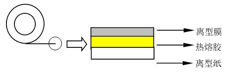 AU25KA、D3451和LF0100等热熔胶膜是由PET离型薄膜上单面涂布接着剂并半固化而成,并贴有单面涂布PE用于分离的离型纸。